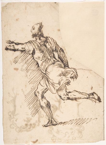 Editor: Here we have "Beggar with two crutches" by Jacques Callot, held at the Städel Museum. It's an ink drawing that feels both Baroque in its drama, but almost sketch-like in its quickness. There’s something almost unsettling in how exposed the figure is, his musculature almost raw. What strikes you most about this drawing? Curator: Raw is such an apt word for it. Callot's beggars are never romanticized, are they? This drawing feels like a punch to the gut. The lines, almost frantic, map the hard topography of poverty onto the beggar’s very skin, doesn't it? It’s visceral, almost like an anatomical study of hardship itself. Do you find yourself focusing on the detail or the overall impression? Editor: I think both are striking in different ways. The quick details of his face draw me in, but then the overall image is undeniably one of struggle. The figure is just *there*, exposed with all its burden, without frills. I'm curious though – why beggars? What do they signify here? Curator: I think for Callot and his audience, beggars represent a society fraying at the edges, a moral mirror reflecting anxieties about wealth and poverty. This was a period of war, famine, and stark inequality, so images of the marginalized held a powerful, often uncomfortable, truth. Do you see it as a commentary or a detached observation? Editor: That's a great question. I initially read it as observational. But given the historical context you describe, I now lean toward social commentary. It seems impossible for an image this visceral to *not* carry a message. Curator: Absolutely. It’s in those scratchy lines, isn’t it? They almost shout. It's a drawing that doesn’t let you look away. And that's its power. Editor: Yes, definitely a new layer revealed to me, thank you!