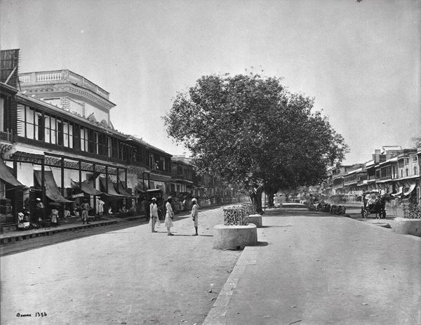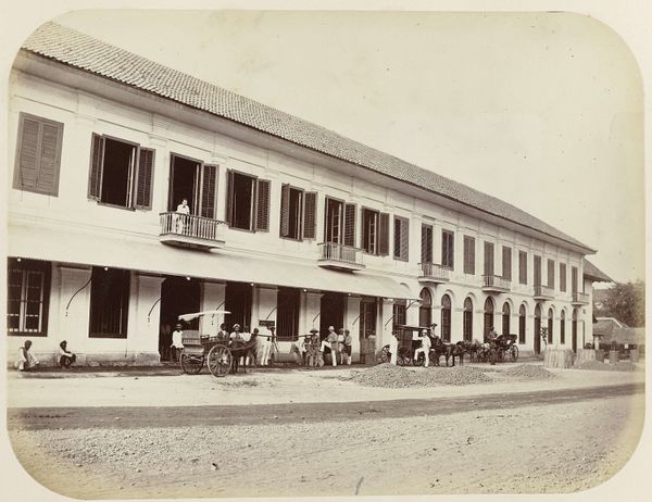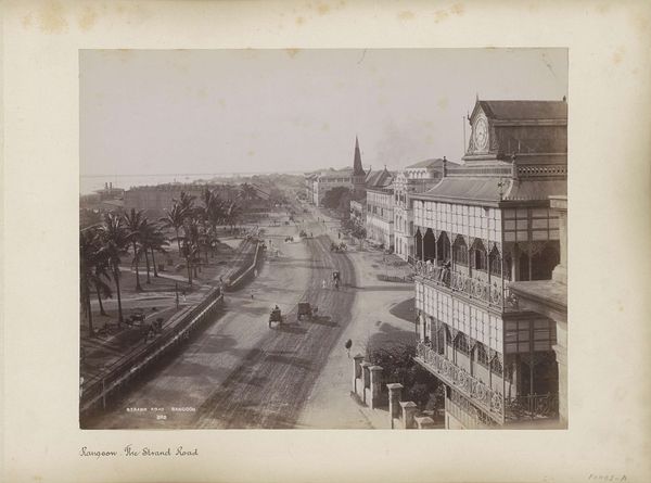 Curator: Let's delve into this remarkable photograph titled "View of Chandni Chowk in Shahjahanabad, Delhi, India," captured by Samuel Bourne between 1865 and 1870. It's an albumen print, which was a popular method at the time for its sharp details and tonal range. Editor: It has this very subdued feel about it. The sepia tones lend it a sense of nostalgia, almost like a distant memory. You can almost feel the heat and dust of the street despite its quiet stillness. Curator: Bourne's work offers valuable insight into the socio-political conditions of colonial India. Photography during this era wasn't just documentation, it actively participated in constructing a specific image of the 'Orient' for Western audiences. It played into narratives of empire. Editor: Absolutely, it is impossible to disassociate these images from colonialism. The apparent "authenticity" of the photographic medium created an almost irrefutable sense of truth, which then could easily be manipulated for imperialist agendas. Consider the framing itself – is this truly an objective 'view', or is it carefully constructed to communicate something specific about the 'exotic East' versus 'rational West'? Curator: It’s a calculated portrayal. Notice how the wide street creates a sense of order, perhaps a deliberate contrast to the bustling markets we might expect. This representation potentially minimizes any signs of resistance or social disruption. The almost vacant space speaks volumes. Editor: Exactly! The relative absence of people despite the signs of commerce hints at the control and imposed order by colonial power. Even seemingly neutral cityscapes can participate in power dynamics. Whose gaze are we adopting? How did the subjects react to being photographed in this context? The silences around the image can be very telling, perhaps hinting at both visible presences and erasure of identities in historical records. Curator: It allows us to reflect critically on how photographic representation reinforced the colonial narrative of control. Bourne’s photographs need to be understood not merely as records, but as constructions shaped by ideology and the intended audience back in Britain. Editor: The act of seeing is never neutral. Examining pictures like this requires confronting uncomfortable questions about history, power, and the ongoing impact of colonialism on visual culture. Appreciating beauty alongside the difficult political truths that inform the work enriches our comprehension, allowing it to move beyond face-value perception into critical consciousness.