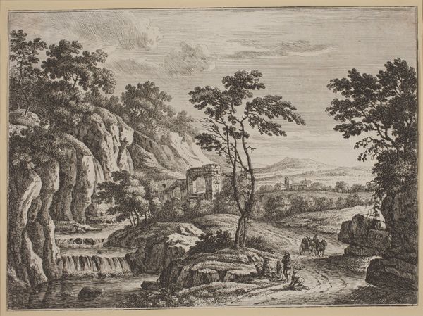 Curator: This is "Cephalus and Procris," an intaglio print made around 1558 by Hieronymus Cock. Editor: The landscape is truly breathtaking, almost dreamlike in its rendering, yet there is something decidedly melancholic about this idyllic scene. The details are so precise yet feel slightly unsettling. Curator: Indeed. Cock masterfully manipulates light and shadow through the intaglio process. Notice how he employs cross-hatching to create depth, drawing our eye across the vast landscape towards the distant cities. This technique not only defines form but also evokes an almost palpable sense of atmosphere. Editor: It’s interesting how the landscape dominates the mythological narrative. I'm struck by how the setting, filled with meticulously detailed flora and distant architectural structures, overshadows the drama unfolding between Cephalus and Procris in the lower corner. Does this prioritize the landscape and diminish the overt narrative drama of the Ovidian tale, perhaps reflecting a changing worldview? Curator: The relationship between foreground and background becomes central. We see an increasing interest during the Renaissance of locating the drama of mythology in a complex engagement with nature. Furthermore, the scale helps render humans fragile. Look, for instance, how Cock manages texture. The dense foliage contrasts sharply with the smooth expanse of the water, a testament to his technical skill with the burin. It calls attention to its artifice. Editor: This emphasis feels very relevant given how art served to portray status. Such elaborate details speak of privilege and a keen interest in displaying earthly possessions as reflections of personal taste, especially the landscape itself as something that can be surveyed and owned. How were such printed images regarded during that era? Were these items largely consumed within noble residences or also by the merchant classes? Curator: These prints, with their relatively reproducible medium of engraving and etching, undoubtedly found audiences among a broader section of society, helping disseminate mythological themes and aesthetic sensibilities beyond just the wealthy elites. Editor: Ultimately, I'm left contemplating how social standing becomes intimately entwined with aesthetics. Curator: Yes, the image highlights how our very sense of self can be shaped by visual experiences.
