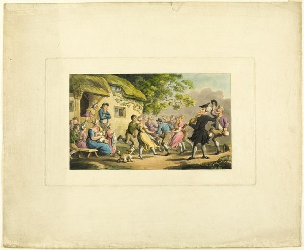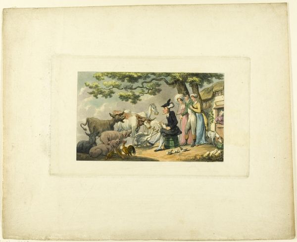 Editor: This is “Doctor Syntax Meditating on the Tomb Stones, from The Tour of Doctor Syntax,” created around 1812 by Thomas Rowlandson. It's a drawing, or perhaps a print? It has the look of an etching on paper. I am immediately drawn to the composition and the narrative aspect; it feels very story-like. How do you interpret this work, in all its detail? Curator: Oh, my dear, it's a delightful tumble into the past! This etching—yes, you're right, the lines give it away—isn’t just a pretty picture, but a sly commentary wrapped in caricature. Rowlandson, that cheeky chap, was illustrating William Combe's poem. Imagine: Doctor Syntax, with his peculiar hat and equally peculiar posture, stands amidst these stones. It's not just about history; it's about poking fun at scholarly pretension. Do you notice how the landscape behind seems to mimic his exaggerated features? The world is in on the joke! Editor: That's so interesting! So it is a humor piece rather than a serious depiction? Curator: Absolutely! The exaggerated expressions, the slightly absurd poses – it's all part of the jest. But think, too, about the Romanticism that bubbles beneath the surface. Graveyards, ruins... the Romantics adored these symbols of mortality. Rowlandson is playing with that trend, giving it a good-natured nudge. It makes one wonder about the seriousness of our endeavors, doesn't it? Editor: It does, yes. I’ll never look at a graveyard the same way again! Curator: Exactly! That's the beauty of art; it tweaks our perspectives, turns things delightfully upside down.