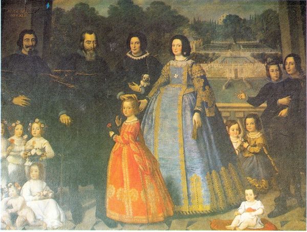 Editor: This oil painting, created in 1662 by Juriaen Jacobsz, is entitled "Michiel de Ruyter and his Family." It’s a large group portrait. The clothing strikes me, it speaks to immense wealth. What’s your read of this piece? Curator: Looking at the historical context, this is more than just a family portrait; it's a deliberate construction of public image. Michiel de Ruyter was a celebrated admiral. How does this image, strategically presented in its time, bolster his societal standing? Editor: You’re right. His wealth is visually on display, so I see this as communicating power. There's also the idealized background – nature and architecture perfectly combined. Was this typical of Dutch Golden Age portraiture? Curator: Yes, that carefully curated combination of cultivated landscape and classical architecture signified refinement. More importantly, how do elements like the family dog and de Ruyter’s stance challenge our contemporary understanding of familial power dynamics versus individual achievement during the Dutch Golden Age? Editor: The dog makes the scene seem so domestic, less staged and more relatable. As for his stance, he's front and center, looking directly at the viewer, as if asserting his authority. Curator: Exactly! And consider where this would have been displayed. Was it accessible to the general public or intended for a more exclusive audience? The public display impacts the message being delivered. Editor: This gives me a lot to think about in terms of intended audience and the messages portrayed through family and status symbols! Curator: Indeed. Reflecting on its visual and social facets expands how we interpret artworks, prompting dialogue on representation and socio-political influences.