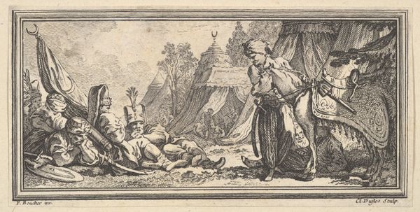 Editor: Here we have Stefano della Bella’s "Cephalus and Procris, from 'Game of Mythology'," dating back to 1644. It’s a print, quite small and delicate. What strikes me is how posed and theatrical the figures appear despite the natural setting. How do you interpret this work? Curator: This print serves as a window into the enduring power of classical myths and their symbolic representation through time. Look at the figures' gestures and attire. Do they remind you of anything? Perhaps characters from well-known Renaissance paintings, even though this is Baroque? Editor: Yes, their stances do seem very familiar, echoing earlier depictions of mythological heroes. Curator: Exactly. The landscape itself becomes a stage where personal tragedy unfolds, filled with layers of meaning. The dog, so faithfully rendered, may symbolize loyalty, hinting at the complex relationships within the myth. Do you know the story of Cephalus and Procris? Editor: Vaguely… Wasn’t it a tale of mistaken identity and jealousy? Curator: Indeed. Bella captures a moment imbued with dramatic irony; we, the viewers, are privy to the unfolding tragedy. Each element – the hunting spear, the faithful hound, the distant landscape – amplifies the emotional weight of the scene, embedding cultural memories into visual forms. Editor: That's fascinating. I hadn't considered how the symbols contribute to a deeper understanding of the narrative and its emotional impact. It makes the work so much more compelling. Curator: Precisely. These aren’t just decorative figures, but embodiments of complex emotional and cultural themes, accessible even centuries later. Editor: I see now that examining these images over time gives them a renewed importance. Thank you for offering this lens.