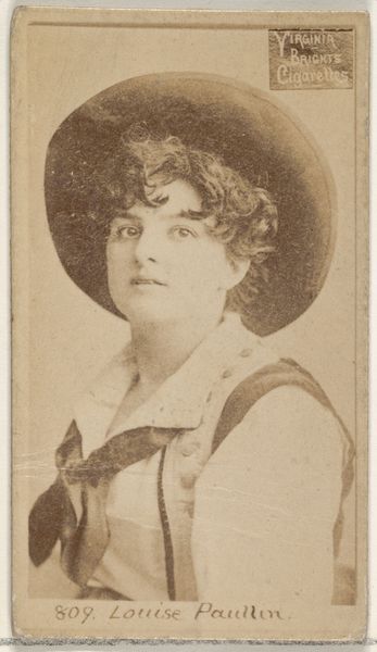 Curator: Ah, yes, here we have a promotional photograph. It depicts Mlle. Rordame, from the Actors and Actresses series (N145-8) produced by Duke Sons & Co. to promote their Duke Cigarettes sometime between 1890 and 1895. These were essentially trading cards. Editor: There's a wistful fragility to this sepia-toned portrait. Her large hat casts a soft shadow, like she is shielding herself somehow. It's quite dreamy. Curator: It is interesting how tobacco companies used images of actresses and other famous personalities to market their products. Consider the labor involved; the cultivation, the processing of the tobacco leaves, the printing, the distribution... It speaks to the immense power and reach that these companies commanded. Editor: And to imagine the lives intertwined in such a commodity. Mlle Rordame becomes a vehicle. She's both present and absent at the same time. This little image whispers of her world, and all those people connected to her life just for this brief promotional flash. I wonder if she smoked... Curator: That’s quite possible. Think about the proliferation of print culture during this era; advertising infiltrated every facet of daily life, reinforcing particular ideals and behaviors. These cards offered visual snippets, almost glimpses, of glamour that were then inextricably linked with the act of consumption. Editor: Looking at it this way helps me move past the simple advertising aspect. The faded light gives it a feeling of a lost relic that might be connected to a whole hidden narrative about the people involved in this story, if we could just track down their names and connections. Curator: Exactly. When considering the means of production we start understanding the complex system behind seemingly simple things. From raw materials to finished product and its impact on a culture. Editor: It's more than just a card promoting cigarettes. It's about labor, consumerism, representation, desire… It shows, yet conceals. Thank you. Curator: Yes, reflecting upon these images unveils societal structures embedded in something as trivial as a tobacco card.