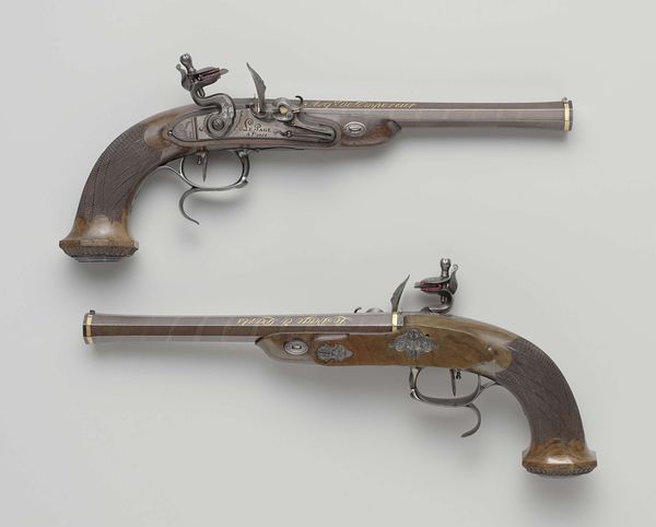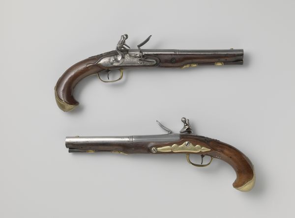 Curator: These flintlock pistols, crafted between 1780 and 1795 by Johannes Rousseau, possess an immediate, austere elegance. What are your initial thoughts? Editor: Stark. Almost coldly functional, despite what I suspect are some attempts at Baroque ornamentation. A lethal grace comes to mind. Curator: Precisely. While utilitarian in function, their very form and decoration speak volumes. Notice the wood carving and the metalwork. The emblem they bear is of the Admiralty of West Friesland, immediately telling us something about provenance, about the intended owner. Who might have wielded such an instrument? What class and status did ownership entail? Editor: These were tools of power, definitely. Beyond simple defense. Think about the Dutch maritime power at this time, what was happening socially and politically both locally and further afield in the colonies... this wasn't merely personal protection. This represents authority. Consider the psychology of possessing something like this. Curator: And how this intertwines with the West Frisian identity during this period! This province played a crucial role in Dutch maritime history. These aren't generic weapons; they're imbued with specific historical and regional meaning, made to last, too; a symbolic visual shorthand, declaring alliance with very defined social hierarchies and all the power dynamics and implications implicit in them. What does the symbol of seafaring or the idea of "exploration" or of a "province" even signify to the original populations that colonial forces met, and did violence against, on the ground in colonised countries at the time? The social framework of ownership requires some unpacking. Editor: Exactly. And you see how, beyond that regional association, a certain set of values get attached to these tools? They almost take on an aura... it makes me think of ceremonial objects despite obviously being built to be used. They almost accrue some innate spirit and energy. Curator: These pieces allow us to confront complex issues of power, trade, violence, and cultural identity. Through understanding their multifaceted existence within a complex social framework, we see a greater cultural memory being unearthed. Editor: The pistols remind us how physical objects, even ones designed for violence, can be incredibly layered carriers of meaning, ripe for broader understandings about society and ourselves.