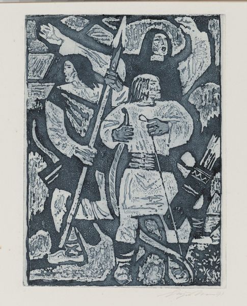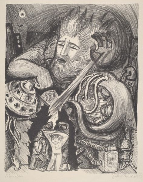 Editor: This is Reginald Gammon's "Shame," a 1947 drawing. The abstract figures kind of leap out, but there's this overwhelming feeling of darkness. Almost oppressive, actually. How do you interpret this work? Curator: "Oppressive" is interesting. It makes me think of the weight of secrets, doesn't it? I see shattered masks, glimpses of humanity struggling within fractured forms. Do you feel it's accusing, or is there something else at play, maybe a personal struggle rather than societal blame? Editor: Hmm, personal struggle is possible, especially given the title. It’s like Gammon’s externalizing something deeply internal through those stark lines and jumbled figures. Curator: Absolutely! It's as if the shame has become a tangible entity, almost a grotesque puppet master pulling the strings. What do you make of the geometric shapes interwoven with the organic forms? They clash in ways I find unsettling. Editor: They are strange! They could represent societal structures that cause shame or something? I hadn't thought of that. Curator: Perhaps, or maybe even the attempts to contain or define such a raw, unmanageable emotion within rigid confines. Think about how the composition sort of locks you in, forcing you to confront this disquiet. Does that resonate with you? Editor: It does! Now that I think about it, it’s almost impossible to look away. This makes me realize the power of art to be like a mirror… uncomfortable, but necessary. Curator: Precisely. It holds up a mirror, reflecting back uncomfortable truths, both personal and collective. That's its magic, isn't it?
