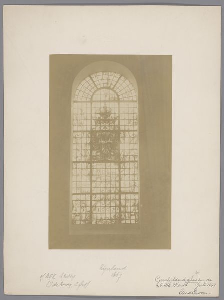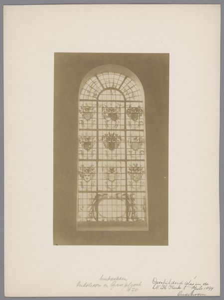 Editor: Here we have an image titled "Geschilderd raam in de Hervormde Kerk te Westmaas", which translates to "Painted window in the Reformed Church at Westmaas," dating from around 1890 to 1920, attributed to an anonymous artist working for Monumentenzorg. The subdued monochrome tones evoke a sense of historical solemnity. How do you interpret this photograph of a stained-glass window? Curator: This photograph offers a fascinating lens through which to examine the relationship between religious institutions, artistic expression, and social power at the turn of the century. Who was commissioning this type of artwork, and what messages were they intending to convey through the imagery in the stained glass? Think about the political and social contexts of the Reformed Church in the Netherlands during this period. Editor: So, beyond just the aesthetics of the window, you're saying it's important to consider the motivations and the societal influence of the patrons. Was stained glass in the Reformed Church potentially making statements about religious authority, class, or even national identity? Curator: Exactly. What stories were the patrons wanting to be told in a time when industrialization was taking hold in many societies? Stained glass windows have often operated as pedagogical tools, instructing the masses through visual narratives and imbuing the space with a sense of divine legitimacy. Who benefits from those narratives, and who might be excluded or marginalized by them? This monochrome photo filters out color – how does this limit or expand its accessibility? Editor: This makes me think about the accessibility of art, and that even its creation or curation, isn't always a neutral process, and can reinforce existing social structures. Curator: Precisely. We need to actively question and unpack the layers of meaning embedded within seemingly simple photographs such as this, seeing how they interact with, and perhaps even perpetuate, power dynamics. Editor: That's a really important way of looking at art; it’s given me a lot to consider about the purpose of religious artwork. Curator: Indeed. Context is essential to understand not just the aesthetic choices, but the societal currents that shaped its creation and legacy.