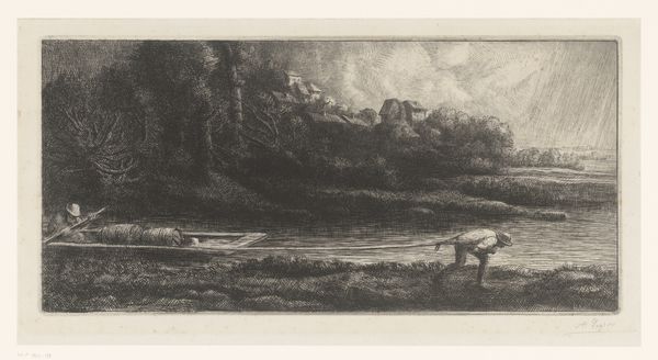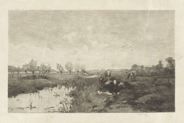 Elias Stark created this print called 'Duck Hunt' using etching. Stark, born in Amsterdam, depicts an idyllic scene, reminiscent of the Dutch Golden Age landscape paintings. But who is afforded the luxury of leisure? Duck hunting, then as now, speaks to class and access. Here, we see the Dutch landscape from a particular point of view; that of wealthy men, equipped with guns, a boat, and a dog, who take aim at the wildlife. Stark was known for his animal paintings. He brings an intimacy to this natural scene that makes one consider the relationship between humans and the natural world. Does this image reinforce traditional ideas about man’s dominion over nature or does it offer a more nuanced narrative? The meticulous etching brings a stark beauty to the scene, which may leave the viewer to question the ethics of this hunt.
