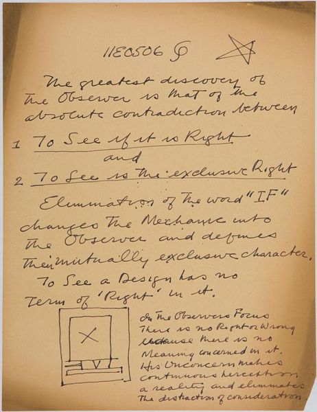 Curator: Stuart Davis’s "Art Theory Text with Sketch" seems like more than just notes; it’s a declaration of his artistic intentions. What strikes you about it? Editor: It's a peek into his mind! The handwriting is so personal, almost like a stream of consciousness alongside that little grid. What do you make of the relationship between the words and the sketch? Curator: Considering Davis’s leftist politics during the Red Scare, the "spontaneous intuition" he mentions might be a subversive embrace of individual expression against societal conformity. The grid, then, is perhaps the system he’s fighting against, or attempting to re-imagine. How might his cultural context have influenced his theory? Editor: That's fascinating! I hadn't considered the political implications. I guess art isn't just about aesthetics; it's also about power and resistance. Curator: Exactly. By understanding the historical context, we can appreciate the deeper layers of meaning in what might initially seem like a simple sketch. Editor: I'll definitely look at art with a more critical eye moving forward.