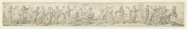 Editor: Here we have Louis Licherie de Beurie’s "Allegory of America," created sometime between 1640 and 1687. It appears to be a drawing or print, maybe an engraving, depicting a triumphal procession. The material execution feels very delicate, almost fragile. What stands out to you about this work? Curator: The choice of medium itself – engraving – speaks volumes. It's not just about rendering a scene, it's about the *reproducibility* of an idea. Engravings were instruments of knowledge dissemination. This “America” is being packaged and distributed, a commodity circulating within a European system of representation. Notice the allegorical figures themselves, are they really ‘of’ America, or European fantasies *about* America constructed for a European audience? What labor went into producing the work, from the extraction of materials to the artisanal skills? Editor: That’s a fascinating point about reproducibility and dissemination! So the value lies less in the artistic skill and more in the message conveyed? I'd assumed "Allegory of America" was meant to glorify the New World, but you're suggesting it’s more about control and ownership through representation? Curator: Exactly. Consider how the materials used – the paper, the ink – were sourced and traded. And what's *being* traded is not just a picture, but a constructed vision. How does this idealized representation affect actual social relations and material conditions? Who profits from the circulation of these images, and what are they selling, precisely? Editor: I never considered it that way. Seeing it as part of a larger economic and political system makes me think about the true cost of these idyllic portrayals of America. Thank you for making me realize there is more than just a pretty picture, here! Curator: Indeed! It reveals the material underpinnings of artistic production and cultural exchange. Now, how might *we* deconstruct these kinds of visual economies today?