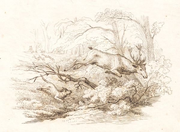 Editor: Here we have Martinus Rørbye’s 1834 print, “Illustration til "Halvhundrede Fabler for Børn" af Hey," currently housed at the SMK. It’s a delicate engraving dominated by line work. The image shows two storks tending to their nest, set against a backdrop of quaint buildings. The fine lines and overall sepia tone create a feeling of stillness, almost like a faded memory. What catches your eye when you look at it? Curator: Formally, the interplay between the graphic precision of the lines and the relative openness of the composition is immediately striking. Note how the hatching defines form and texture, particularly in the rendering of the nest and the thatched roof. The varying densities of line create a sense of depth, pushing the background further into space. This piece is not just about what is depicted but also about *how* it's depicted. Do you notice any contrasting elements in the composition? Editor: I do see that the foreground feels very dense and textural, with all the lines creating the nest, and then the background is more sparse. Curator: Precisely. The contrast highlights the storks' domain versus the human world beyond. We should consider that line engraving, a demanding process, enabled Rørbye to achieve a remarkable level of detail. How might that impact our understanding? Editor: Perhaps it shows a dedication to capturing the specifics of the natural world and rural life? Almost scientific in its observation? Curator: Exactly. It signifies his keen observation translated with high technical skill, all through close examination of form and texture. Through formal analysis, we can begin to discern not just the *what*, but the *how* and the *why* of its making. Editor: This has completely changed how I view this work, what I saw as a charming fable is the artist deliberately drawing contrasts in the rural life! Curator: Indeed, that’s the power of focusing on the formal properties and material qualities. It's an invitation to explore the depths of artistic intention through its execution.