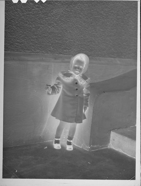 Curator: This small, untitled photograph by Lucian and Mary Brown features a young girl in a plaid dress, frozen in a moment of what seems like pure, unadulterated play. Editor: There's a ghostly quality to this image, a sort of haunting captured in the child’s extended hand and the faded details of the room. It evokes a strong sense of temporality. Curator: Indeed. The contrast between the sharp focus on the girl and the soft background really draws your eye to her movement, like she's about to twirl right out of the frame. Editor: I'm also drawn to the wallpaper. It’s a domestic space, yet the high-key lighting almost erases the subject as an individual, emphasizing instead the social construction of childhood. Curator: It's a delicate balance, isn’t it? The Browns capture this intimate moment, but that stark lighting you mentioned elevates it beyond the personal, almost to an archetype. Editor: Precisely, it’s a reminder that even seemingly simple snapshots can carry a lot of complex weight about how we view innocence and belonging. Curator: It leaves me wondering about her story. What was she thinking in that moment? It’s a quiet, powerful question that resonates beyond the frame. Editor: Yes, and in a way, the lack of a title lets us project our own narratives onto her, connecting our own experiences to this fleeting, photographic instant.