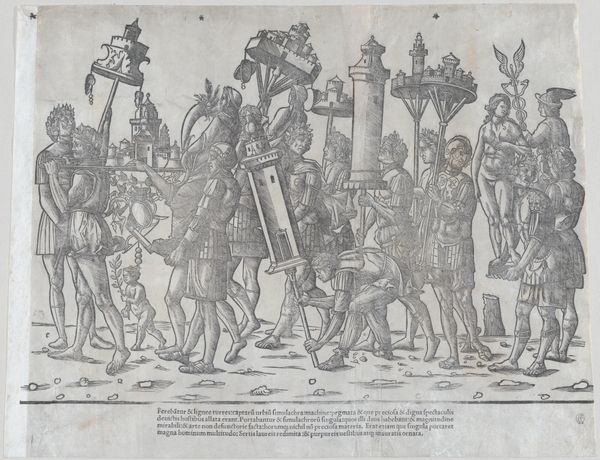 This print of a Roman Legion, after a section of Trajan's Column, was made by Marco Dente in the 16th century. At first glance, the linear precision and dense arrangement of figures command attention. Dente's use of hatching and cross-hatching creates a rich texture. The formal structure is defined by horizontal bands of soldiers interspersed with vertical standards. The composition alludes to the historical and cultural context of ancient Rome. The column itself was a medium for communicating power through narrative. Dente's print captures the column's semiotic function, translating stone into a new visual language of ink and paper. By rendering this scene, Dente engages with a broader discourse about the preservation and interpretation of classical forms. Notice how the repetitive patterns of armor and emblems create a sense of order, yet the slight variations in each figure hint at individual stories. The artwork destabilizes our understanding of history by presenting a fragmented yet idealized image of Roman military might, inviting viewers to interpret and reimagine the past.