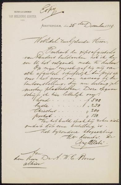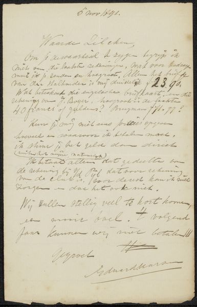 This letter, penned in Utrecht on April 18, 1864, by Dirk van Lokhorst, showcases a striking contrast in its formal elements. The stark white of the paper serves as a ground for the assertive black ink, creating a high-contrast visual field. The composition is defined by a structured cascade of text, each line a distinct stroke of information. The artist’s script, with its loops and sharp angles, conveys an emotional urgency. Lokhorst’s careful arrangement of words, however, betrays the inherent tension between artistic expression and structured communication. We see how the artist uses a grid-like structure to delineate the space for each thought, almost as if he is trying to confine or control the fluid, expressive nature of language. The handwritten form is suggestive of a deeper, more personal narrative that challenges the formal conventions of written correspondence. This piece destabilizes the boundaries between the functional and the aesthetic, urging us to consider the inherent artistic qualities of everyday communication.