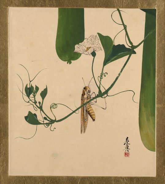 Editor: We're looking at "Insects and Grasses" by Yamamoto Baiitsu, painted around 1847 using ink and watercolor on paper. It’s full of subtle details, almost like a snapshot of a miniature world. How would you interpret this work in its historical context? Curator: Well, what immediately strikes me is how this image participates in the longer history of depictions of the natural world. In 19th-century Japan, painting insects and plants wasn't just about aesthetics; it reflected a deep engagement with scientific observation as well as literati painting traditions. The meticulous detail points toward an interest in the natural world as an area for scholarly and artistic cultivation, but were such paintings always displayed in a public way? Editor: That’s interesting – it’s delicate and intimate, but were there specific cultural or political associations with these kinds of works? Curator: Absolutely. Consider the Ukiyo-e tradition it echoes, mass produced yet visually sophisticated; consider too, literati painting's ties to a scholar-official class and its expression of personal refinement. Were works like this displayed in public exhibitions to elevate art appreciation among ordinary people? Or circulated privately amongst elites? It shapes how we understand Baiitsu’s role and the work's social function. How might its display affect how it would have been viewed at the time versus how it might be viewed today? Editor: So it is a really interesting combination of artistic, intellectual, and socio-political currents then. That reframes my understanding quite a bit. Curator: Indeed, thinking about how it moved between private and potentially public spaces offers a window into understanding both its creation and consumption, as well as the power structures that facilitated these processes. This isn’t just about the insects, it is a document showing how nature, art, and society intersected. Editor: It's been incredibly insightful to consider its social context and potential viewership at the time of creation, thanks.