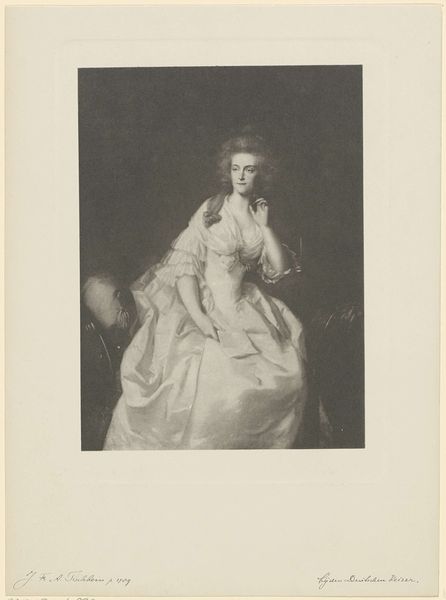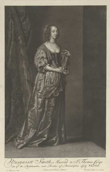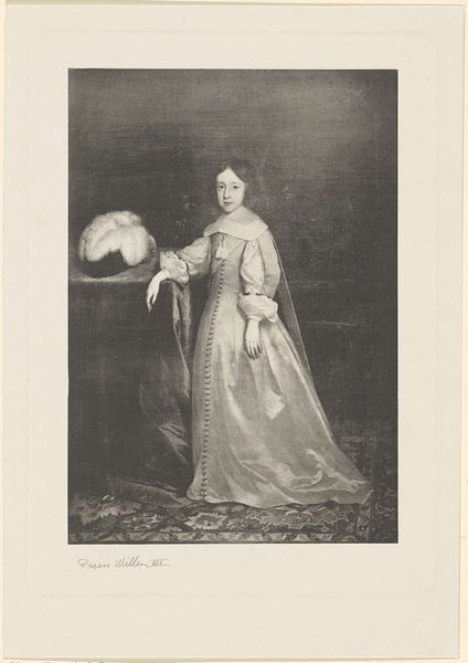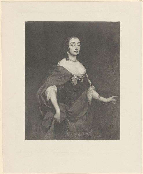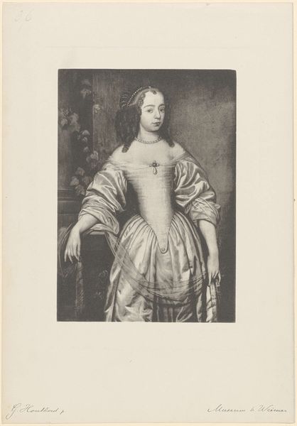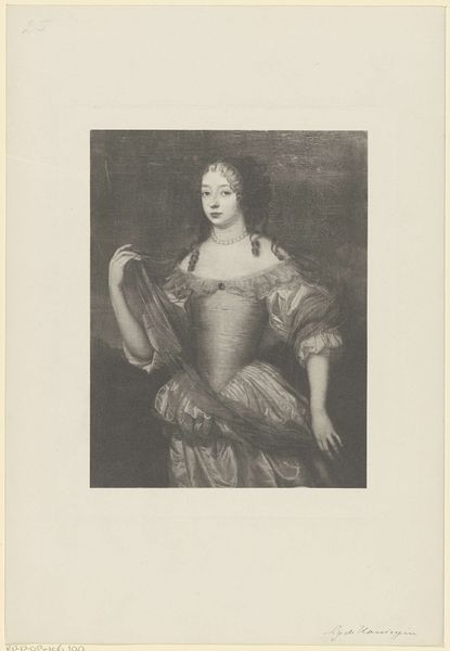 Editor: So, here we have an engraving from the 19th century, titled "Portret van Maria, prinses van Oranje"—that's "Portrait of Mary, Princess of Orange" in English. It's hanging in the Rijksmuseum. There's something very… stately about it. It feels like it's trying to say something grand about history, with that kind of old engraving style. What do you see in it? Curator: Oh, absolutely. It's like peering into a different era, isn't it? For me, beyond the Baroque grandeur, there's a real sense of… melancholy. Think about what being a princess actually entailed. Duty, expectation… sacrifice. She's beautiful, yes, adorned with pearls, but look at her eyes. Don't they hint at a deeper story? What's your read on her expression? Editor: I guess there is a little sadness there, now that you point it out. She looks elegant, but a bit tired, or like she's seen something difficult. So this is not just a pretty picture? Curator: Precisely! It's a coded message about power and responsibility. The landscape behind her isn't just a backdrop; it's a symbolic realm, a controlled wilderness mirroring the constraints of her position. What's truly wild can’t be contained. It might be a yearning to be, quite simply, Mary. Free to wander. That ribbon in her hand… it almost feels like she is holding tightly to a life that she almost, but does not have. Don’t you think? Editor: That makes the portrait so much more interesting now. It is about the weight of responsibility on the woman. I was really just seeing it as an important person’s portrait, without realizing that that itself has deeper cultural meaning. Curator: Exactly! It’s in these hidden spaces within a piece of art, that it whispers a silent symphony about identity, position, constraints and unspoken desires, doesn't it?