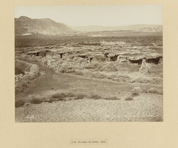 Editor: This is "Looking Across the Colorado River to Mouth of Paria Creek," a photograph by Timothy O'Sullivan. The vast landscape almost feels otherworldly. What significance do you find in this image? Curator: O'Sullivan was part of a geological survey, and this image, like many from that era, carries the weight of exploration and westward expansion. The river becomes a symbolic threshold. What feelings does the lone figure evoke? Editor: A sense of solitude, perhaps, and the insignificance of man against nature’s grandeur? Curator: Precisely. The figure also anchors the human presence, suggesting a complex relationship between man and the sublime landscape. This tension is what makes the image so enduring, isn’t it? Editor: I see what you mean. It is not just about documenting but about humanity’s place within the landscape.