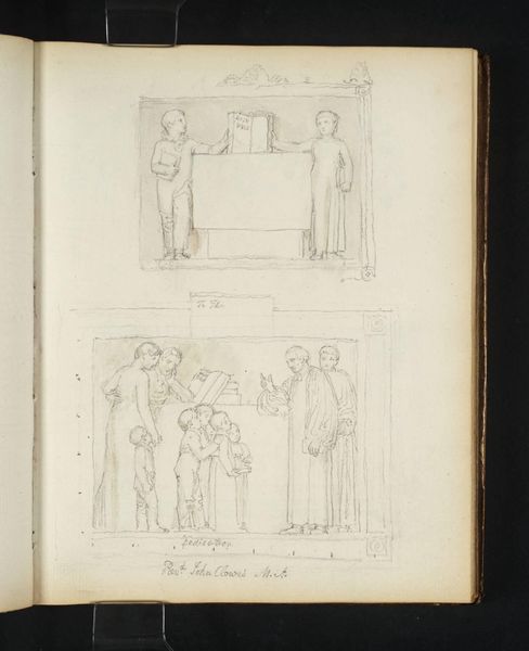Curator: Here we have an untitled sketch by John Flaxman, active in the late 18th and early 19th centuries. It's a delicate watercolor on paper, part of the Tate Collections. My first impression is of its tender, almost ethereal quality. Editor: The lines are so spare. You see the labor of drawing revealed—the quick decisions and the deliberate omissions of detail give it immediacy. Curator: Exactly. The imagery of the mother and children resonates with historical notions of domesticity and virtue, but perhaps also questions the burdens placed upon women in that era. It invites dialogue about female agency within a patriarchal society. Editor: I'm struck by how little material substance there is, yet the emotions conveyed are monumental. The simplicity of means speaks volumes. Curator: It reminds us that art, like social structures, is built upon layers of ideas and materials. The sketch becomes a site to examine their interactions. Editor: Yes, tracing the physical act of creation, the paper and ink, allows us a tangible link to the artist's world. Curator: It gives us another dimension to explore the role of women and family in art. Editor: Precisely, a compelling reminder of how art can illuminate material and conceptual frameworks.