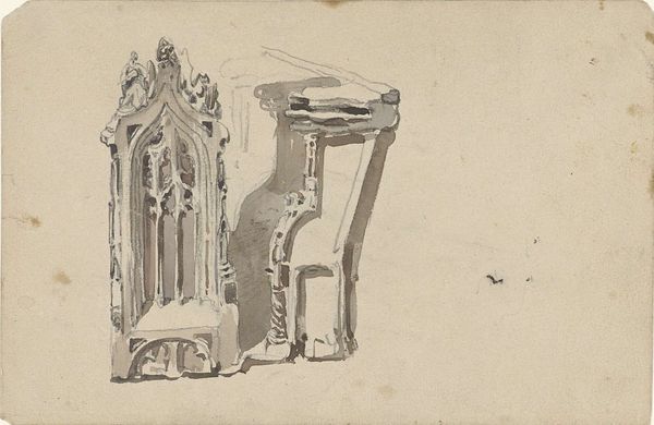 This is a sketch by John Sell Cotman, depicting a ruined church interior with a chair, rendered with graphite on paper. The drawing's material simplicity – graphite as a readily available medium – belies the complexity of the scene it captures. Notice the textures Cotman coaxes from the graphite, from the smooth surfaces of the stone arches to the rougher, shadowed areas suggesting decay. The lines are not just descriptive, they are evocative, hinting at the passage of time and the weight of history bearing down on this abandoned space. The choice of subject itself is revealing. Cotman was working at a time of immense social upheaval, the rise of industrialization, and the decline of traditional ways of life. By focusing on the ruins, he’s reflecting on the fragility of human endeavors, and perhaps even critiquing the relentless march of progress. Cotman reminds us that even the simplest materials, when wielded with skill and intention, can carry profound meaning. It challenges us to look beyond the surface and consider the social and cultural forces that shape both the artwork and our understanding of it.
