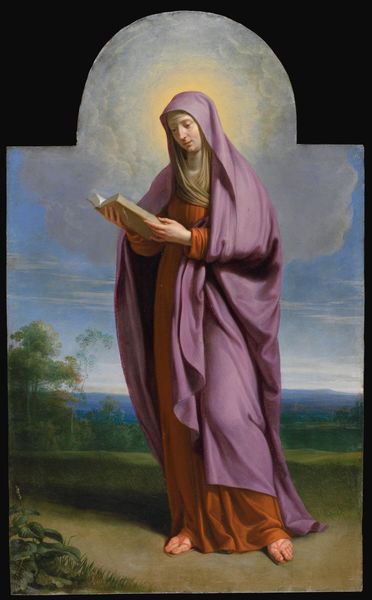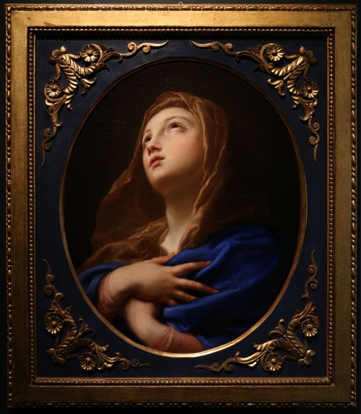 Editor: This is Bartolomé Esteban Murillo's "Dolorosa," painted around 1665. It's an oil painting, and the museum label mentions it is a masterpiece of the Baroque style. I’m immediately struck by how the artist uses light to create such a dramatic and emotional scene. What significance do you see in the Madonna’s upward gaze and the way her hands are portrayed? Curator: The upward gaze, traditionally, signals divine connection, a plea, or supplication to a higher power. Murillo captures a raw vulnerability, aligning with Baroque sensibilities of heightened emotion. Her outstretched hands are more intriguing. Are they gestures of offering, receiving, or perhaps even questioning? What does that posture evoke in you? Editor: I think of pleading. She’s almost asking why. The darkness around her makes her suffering feel even more isolated. It's powerful. Curator: Indeed. This chiaroscuro, the strong contrast between light and dark, is quintessential Baroque. It isn't merely aesthetic; it amplifies the psychological drama. Think about the symbolism inherent in light versus darkness – ignorance, hope, despair. What do these contrasting elements say about humanity? Editor: It’s as though she represents humanity, caught between suffering and the hope of something better. The image invites empathy; perhaps viewers connect with universal human feelings. Curator: Precisely! The Madonna is an archetype – the grieving mother, the embodiment of compassion. Murillo skillfully taps into this well of shared experience. Her iconography remains culturally significant centuries later. Editor: Thinking about those symbols has given me a new way of approaching similar paintings in the collection. Curator: And seeing the symbols within a context provides greater depth.