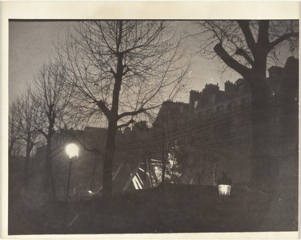 Editor: This gelatin silver print is titled "Night, New York," and it's by Alfred Stieglitz. It was created sometime between 1898 and 1934. The stark contrasts and shadowy scene give it a distinctly theatrical and dramatic air. What does this image suggest to you? Curator: To me, this photograph speaks volumes about the evolving social landscape of early 20th-century New York. Stieglitz, a key figure in promoting photography as fine art, wasn't simply capturing a cityscape. He was capturing a moment in history where urban life was rapidly transforming. Do you notice how the soft focus, typical of Pictorialism, lends a romanticized view to what would have been a gritty reality? Editor: I do see that! It's like a stage set, the soft focus removes detail making the lighting and composition stand out. It isn't just documenting but presenting a particular mood. What do you mean about the gritty reality? Curator: Consider the rapid industrialization and immigration happening at the time. Cities were becoming crowded, class divisions were widening, and with that came social tension. Stieglitz's photograph, through its deliberate aesthetic choices, subtly romanticizes urban life, offering a carefully crafted view that may not fully reflect social complexities. Think of him almost like a film director framing a specific narrative. What kind of statement is he making by focusing on light and architectural grandeur and by minimizing the presence of everyday citizens? Editor: That makes a lot of sense. He is carefully choosing what he is showing. Almost creating an illusion of the city, a very controlled image. I suppose that is a political act. Curator: Exactly! Art, even photography which claims to be documenting, never exists in a vacuum. Understanding the social, cultural, and institutional forces surrounding its creation allows us to critically engage with it. We start to question, 'Whose story is being told and whose is being left out?' Editor: It's fascinating to think about how much history and social commentary can be packed into a single photograph! I'll never look at cityscapes the same way. Curator: And hopefully, that awareness will extend to your engagement with all art forms. Consider not just the aesthetic beauty but also the cultural and historical context within which that beauty emerges.