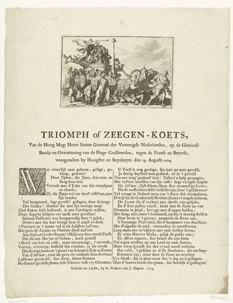 Curator: What a stark and busy scene! My eye struggles to find a place to rest. There's a real sense of chaos depicted here. Editor: Indeed. We're looking at "French atrocities in Bodegraven and Zwammerdam, 1672", an engraving created in 1673 by Romeyn de Hooghe, currently housed at the Rijksmuseum. It vividly depicts the brutal events of the Franco-Dutch War. Curator: The composition certainly contributes to that sense of chaos. See how the artist employs a dense, almost claustrophobic arrangement of figures and burning structures. It feels deliberate, aimed at overwhelming the viewer. What do you make of the banner floating above the turmoil? Editor: Ah, that’s a potent symbol. The banner, held aloft by allegorical figures, proclaims "French Tyranny." De Hooghe uses this propagandistic element to ensure viewers understand the piece not just as a depiction of violence, but as a condemnation of French aggression during the war. He leaves little to interpretation, aiming for maximum impact. Curator: The contrast is so jarring—the banner of tyranny and the beautiful, decorative frame surrounding the central image! The meticulous details in the architecture set ablaze are striking as well, especially considering the relatively small scale. Editor: The print medium allowed for the wide distribution of this imagery, influencing public opinion during a critical period. Beyond simply conveying information, art such as this functioned as a crucial instrument in shaping national identity and mobilizing resistance against Louis XIV's expansionist policies. Its aim was to shock and mobilize. Curator: I'm struck by the degree to which the artist prioritizes clarity of message over aesthetic considerations. Although I think the balanced chaos adds something truly special. Editor: Well said. These images played a critical role in shaping collective memory and perpetuating narratives of national suffering and resilience. I come away considering the profound interplay between historical events and the shaping of national identity. Curator: A powerful reminder that what we choose to depict and how we depict it holds enduring historical consequences. It's interesting to consider propaganda's influence.