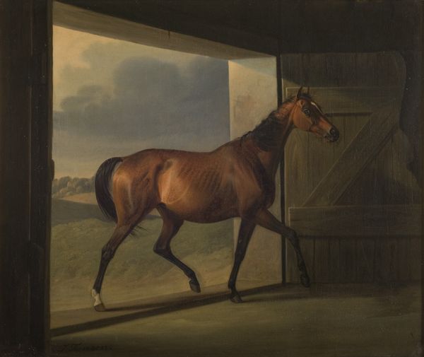 Curator: It has this kind of quiet, self-assured feel to it, don’t you think? Almost like the horse knows something we don’t. Editor: Indeed. We're looking at Fritz Thomsen's “Antonia,” an oil-on-canvas piece created between 1846 and 1850, now residing here at the SMK. It offers a fascinating blend of realism and Romanticism. The horse stands center-frame with such commanding poise and graceful athleticism that I am quite captivated! Curator: Right? And it’s interesting how he places her – this powerful animal, Antonia – in this very domestic, almost docile landscape. A twist, isn’t it? The light dappling through the trees makes it feel like she's stepped right into a fairy tale. There’s a certain idealized beauty, a gentle strength… Editor: Agreed. The light contributes greatly to a serene, arcadian sensibility. However, let's also examine the brushwork and composition closely. Note the contrast between the meticulously rendered coat of Antonia versus the almost blurry rendering of the foliage, as this division yields a kind of symbolic tension, almost like two states of being... Curator: Mmm… Interesting point. I can almost feel the textures, though, can't you? The smoothness of her coat against the rougher bark of the trees... Thomsen’s use of light adds so much dimension; it’s almost sculptural, that chiaroscuro. Editor: Exactly. I mean, the work, considered through a formalist lens, seems intent on investigating pictorial space via figure-ground relationship, juxtaposing both animal anatomy and an exploration of landscape traditions, perhaps referencing naturalistic movements prevalent in that moment… Curator: Always a lot to unravel with a painting, isn't it? I find her peaceful expression juxtaposed against her gait truly magnificent… There's just such a calm self-reliance, an independent majesty in the horse that echoes a kind of freedom. Editor: Indeed, from my standpoint, it appears as though the landscape works in harmony with the horse, and by interrogating form and symbolism, we achieve richer understanding. Curator: Beautifully said, for me I think it’s about that feeling it stirs up: pure, simple connection with nature and oneself... Thanks for sharing your viewpoint; I see even more there now. Editor: It's a mutual exchange. Observing art through these different perspectives helps uncover more of its hidden nature, wouldn't you agree?