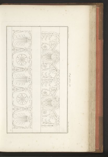 Charles Pierre Joseph Normand created this print of "Fries." It presents a flat, linear composition, typical of architectural drawings aimed at documenting classical motifs and patterns. The cool detachment of the line work creates a sense of ordered clarity, inviting us to dissect the visual components of ancient design. The image reveals an exploration of classical ornamentation, juxtaposing a chair with a frieze. The chair, adorned with circular medallions depicting classical figures, highlights the incorporation of symbolic motifs into everyday objects. Adjacent to it, the frieze presents a rhythmic sequence of stylized flora, demonstrating a fascination with repetitive patterns. Normand’s attention to detail and symmetry echoes the rationalist principles underpinning much of the Neoclassical movement. The juxtaposition of the chair and frieze encourages us to decode how classical forms could be extracted, reproduced, and integrated into contemporary design. The visual language here becomes an exercise in cultural translation, adapting the past for present aesthetic and functional needs. This structured approach highlights how design elements function as signs within a broader cultural dialogue.
