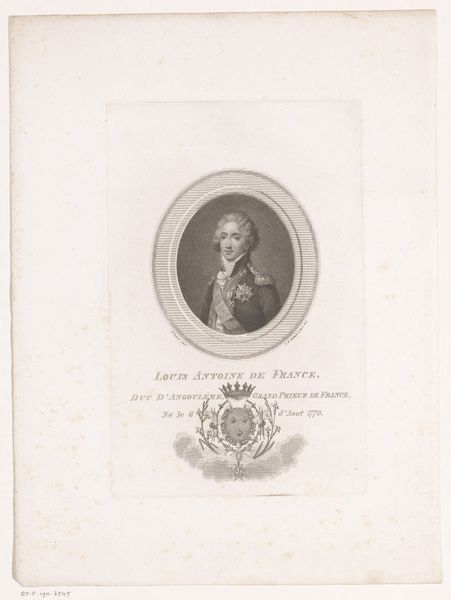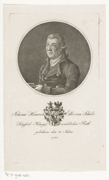 François Gonord created this portrait of Philip Hendrik Quysen, using engraving. The circular frame immediately focuses our attention on Quysen’s profile, a classic composition for formal portraiture. This shape contrasts with the square format of the paper, creating a visual hierarchy. Gonord employs sharp lines and subtle shading to define Quysen’s features and military attire. The lines are particularly important; they not only outline form, but also convey texture, especially in the rendering of hair and clothing. Note the precise, almost mathematical, arrangement of the lines indicating the folds and buttons on the uniform, adding to the effect of dignity. The inscription around the portrait, combined with the coat of arms above, acts as a semiotic system of signs. These elements enrich the symbolic communication of status and identity. Gonord uses these formal choices to communicate not only the likeness of an individual, but also his position within a structured social order. Meaning emerges from the interplay between form and context.