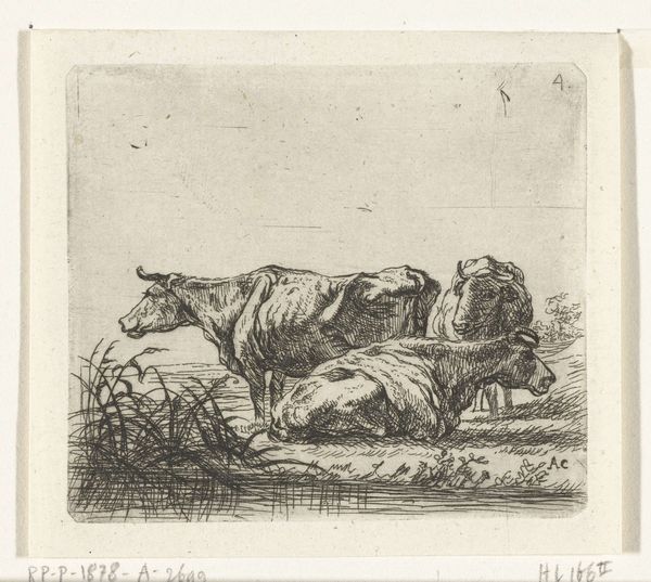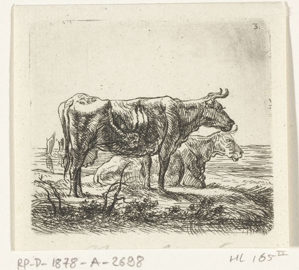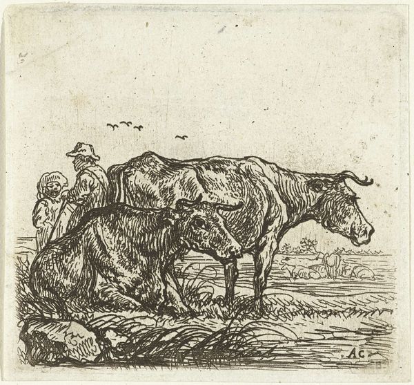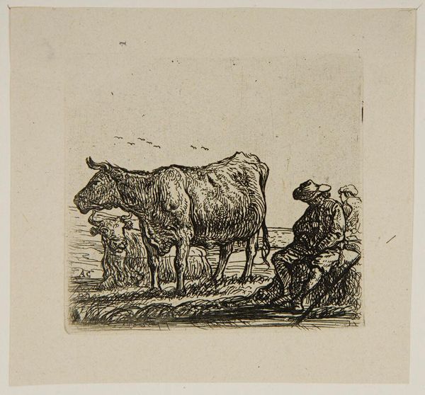 Editor: Here we have "Two Cows with a Shepherd and a Child," a print etched by Ernst Willem Jan Bagelaar in 1814. It has a very…sketchbook-like feel. Informal and kind of charming. What strikes you most about it? Curator: Isn’t it interesting how a simple scene, almost pastoral, can evoke such quiet reflection? For me, it's the stillness Bagelaar captures. The cows, ruminating – perhaps literally, perhaps metaphorically. What do you make of the figures nestled beside them? Almost like they're seeking shelter in the cows' presence, or perhaps just sharing a moment of shared serenity? Editor: It's interesting you mention that because to me it speaks of that time when people lived so much closer to nature than many of us do today, it reminds me of stories my grandparents would tell me of a slower more gentle time. There is so much storytelling in the simplicity. Curator: Exactly! And that simplicity belies the complexity of feeling, doesn't it? I see a yearning for a connection with the land. And perhaps a longing for a simpler existence. There's an echo of Romanticism here, a seeking of solace in the natural world – almost as if nature holds answers we’ve forgotten to ask. Do you think the artist is perhaps telling us that the sacred can be found in the mundane, that profundity can be observed, experienced with Cows even in a basic drawing. Editor: Absolutely! I also see that in the intimacy of the artist who allows the observer into his sketch. As if a peak into his most private and gentle memories. The lines, raw yet elegant and not overly stylized. Curator: Raw elegance – I love that! It encapsulates so much. A memory held gently in the artist's hand, etched onto a plate, and gifted to us across the years. Thanks, this was very beautiful and enlightening. Editor: My pleasure. The experience to me was the best.