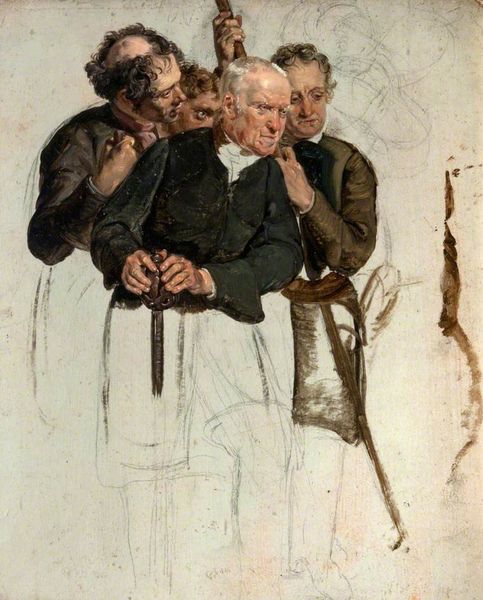 Editor: Here we have Vasily Perov’s *Wanderer*, an oil painting completed in 1869. The muted tones create such a somber mood. What formal qualities stand out to you? Curator: Notice how the artist uses a limited palette, predominantly earth tones, which contributes to the painting's overall sense of austerity. The texture seems quite smooth overall, built from very careful, very subtle gradients and shifts in tone. This gives a photorealistic, and hence modern, feel to the genre scene. Have you considered the effect of this on the viewer? Editor: That smooth texture makes him look timeless. But, are there elements of structural imbalance? He is slightly off center. Curator: Indeed. Consider the placement of the figure within the frame and the use of implied lines. The positioning, slightly off-center, forces the viewer's eye to circle around the darker recesses to the right, creating a tension that amplifies the figure’s… isolation? I think there is some uncertainty in the mood; the dark areas surrounding the main figure force us to acknowledge that we can only grasp him incompletely. Editor: I see, the light source is to the left, directing our gaze but also highlighting the unknown behind him. What else can you tell from Perov's stylistic choices? Curator: I would say his commitment to Realism and genre painting is striking. Through objective, detailed representation of common folk and their living environments, he aims to reveal objective qualities that help one to infer underlying themes of humanism. Consider his subject here. In choosing to portray a person who is humble, weary, or a social outcast, is Perov asking the viewer to look at all segments of society equally, or is his an attempt at a radical intervention? What do you think? Editor: Maybe it's both. Thank you. Thinking about light, color, and texture, in relation to social commentary has changed my perception. Curator: Likewise, considering his aesthetic strategies and underlying sociopolitical commentary is illuminating. Thank you for helping me to refocus my appreciation for Perov's "Wanderer".