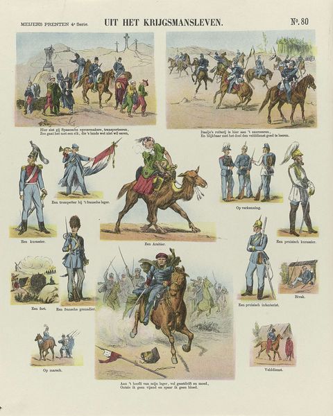 ‘Soldaten’, made by De Ruyter & Meijer, presents a colorful depiction of soldiers, likely dating back to the late 19th century. The image seems to function as an illustrated catalog. We can see a variety of military uniforms, arranged in neat rows, and grouped by rank or function, potentially for the purposes of military recruitment. This print reflects the increasing bureaucratization of warfare and the growth of national armies, with the need for standardized uniforms and equipment. The artists of this image appear to be adopting a neutral attitude towards their subject matter, simply recording the various outfits without passing any judgment. Nevertheless, the image tells us a lot about the social and political context in which it was made. Historians can use sources such as military archives, fashion history, and sociological studies of military culture to more fully understand the history surrounding this artwork and similar images. Art such as this one serves as a window into social and institutional histories.