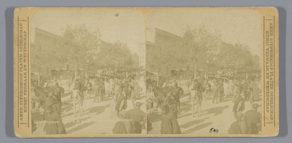 Editor: This gelatin-silver print, titled "[Pair of Stereograph Views of General Jacob S. Coxey's Army of the Unemployed]" by J. F. Jarvis, dating from between 1850 and 1919, really captures my attention. It seems to depict a somber march. What social narratives do you see at play within this photograph? Curator: The image resonates powerfully with the sociopolitical unrest of its time. Coxey's Army, comprised of unemployed workers, marched on Washington D.C. to demand government intervention during the economic depression of the 1890s. Do you notice anything specific about who is included in the image, and how they're represented? Editor: I see a lot of working-class men and they are carrying signs, but the photo itself feels somewhat detached from their struggle. Curator: That's an insightful observation. The photographic medium itself plays a role here. While seemingly objective, it inherently frames and filters reality. What happens if we view the image through the lens of labor history and power dynamics, how does it re-frame our understanding? Editor: It underscores how easily marginalized voices can be visually represented – almost objectified – even in documentation meant to highlight their plight. I also wonder about who had the power to capture and disseminate images like this at the time. Curator: Exactly. The act of photographing becomes an exercise of power, deciding whose story gets told and how. Looking closely, who do you think the intended audience was? The stereograph format suggests a middle-class viewership, consuming images of social upheaval from a safe distance. Editor: It’s almost like rubbernecking, a safe way for viewers to observe these working-class marchers. That casts a whole different light on the scene, and also raises concerns about what's changed and what hasn't in our own era of photojournalism and social media. Curator: Precisely. By questioning the photographer's positionality and the intended audience, we gain a richer understanding of not only the historical event but also the complexities of representation itself. Editor: This has really transformed how I interpret not only the photo’s historical moment but how images like these circulate in culture to shape ideologies about economic inequality and social movements. Curator: It’s by examining these tensions that we find the continued relevance of the artwork, urging us to question power dynamics both then and now.