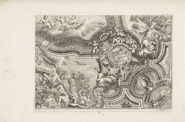 Alexis Loir created this print of a man, eagle, and lion among foliage in the late 17th century. It showcases the period’s fascination with classical motifs, filtered through the lens of the French Baroque. The image is filled with visual codes reflecting the social and cultural values of the time. Note the idealized human form and the inclusion of powerful animals, all entwined with meticulously detailed foliage. This composition speaks to the era's emphasis on order, control, and the harmonious balance between humanity and nature. France, under the reign of Louis XIV, saw the arts as a tool for projecting power and prestige, and the Royal Academy played a central role in standardizing artistic taste. To fully understand this print, we can consult period treatises on art and architecture and examine the patronage networks that shaped artistic production. Through this deeper historical research, we see art not just as a reflection of individual talent but as a product of its time.