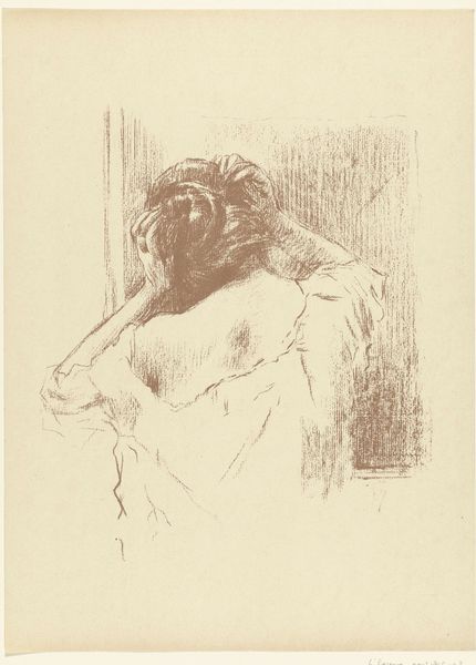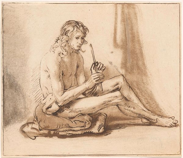 Steven Goblé made this drawing, 'Zittend mannelijk naakt', using pen in gray ink. The composition is dominated by the nude male figure seated thoughtfully, his body rendered with careful attention to musculature and anatomical detail. The monochromatic palette focuses our attention on the interplay of light and shadow across the figure's form. The subject sits on a simple geometric block, a deliberate choice that contrasts with the organic curves of the human body. This juxtaposition highlights a classical struggle between idealized form and lived reality. The figure's contemplative pose, with his hand supporting his head, evokes a sense of intellectual or emotional depth, inviting the viewer to ponder the subject's inner world. The delicate strokes of gray ink used to define the contours of the figure’s body explore themes of humanism and the aesthetics of the human form, echoing the enlightenment's interest in reason and individualism. This artistic decision emphasizes the structure and composition of the piece, and invites ongoing interpretation.