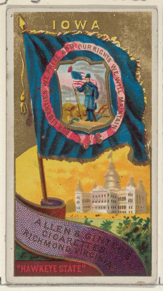 Curator: Here we have "New Jersey, from Flags of the States and Territories," created around 1888 by Allen & Ginter. It's a colour pencil graphic print. Editor: It has an undeniably nostalgic charm, doesn't it? The quaint rendering of industry, offset by the romanticised flag above... there's a tension, but a visually harmonious one. Curator: The composition is structured around contrasting zones, indeed. At the bottom we have an industrial landscape fading into the background, sharply distinct from the azure flag that dominates the upper register, doesn't it? Note how the chromatic unity comes from the gold tassels from the flag reflecting down into the ochres and browns in the depiction of industry. Editor: Exactly, and those very distinct registers are ripe with sociopolitical context. I see a romanticized depiction of the benefits of industrialization masking its actual impact: pollution as a cost of liberty and prosperity is visible in the smog coming from factory pipes. The flag almost idealizes it, with Liberty, in her draped robes and prosperity, offering an abundant floral bounty! Curator: Interesting point, because that abundance doesn't seem fully congruent. Note that "liberty and prosperity," as it's proclaimed, floats like a ribbon *on* the blue ground; in truth, it’s fully integrated, it’s as if liberty is, essentially, the very ground, if we conceive of ground, here, as figure, so as not to impose a figure-ground relationship! Editor: And of course it's crucial to unpack how 'liberty' and 'prosperity' are understood through a specific, undoubtedly skewed, historical lens in the late 19th century, in the so-called gilded age. Who exactly had access to this Liberty and Prosperity? Certainly not the labourers in those very factories, the Lenape people who were there centuries before colonization, or the Black community dealing with reconstruction. Curator: Your emphasis underscores the work’s fascinating ambiguity, or more specifically, polysemy—there's such rich multivalence in Allen & Ginter’s strategic deployment of visual and rhetorical forms. Editor: Absolutely. This image isn’t simply about aesthetic representation. Curator: A close look unveils many possibilities for a work as layered and concise as this one. Editor: And allows us to engage in some critical, much needed historical investigation.