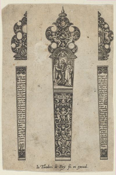 Daniel Hopfer created this intricate metal cut, "Design for the Channels of Fluted Armor," around the late fifteenth to early sixteenth century. Its vertical composition and the contrast between light and dark evoke a sense of depth and texture. Hopfer uses the form of a narrow panel to showcase potential designs for decorating armor. Each channel features a series of motifs, ranging from classical figures and grotesque masks to floral patterns and religious iconography. The symmetrical layout of these designs emphasizes a sense of order and balance but the fantastic nature of the individual elements introduces a destabilizing effect. The metalcut technique enhances the sharp, graphic quality of the lines and shapes. Hopfer masterfully blends traditional ornamentation with innovative design, reflecting the period's fusion of humanist ideals and artistic experimentation. This challenges fixed meanings and engages with new ways of thinking. Consider the implications of presenting armor as a canvas for elaborate decoration; it transcends the object's practical function. The design itself becomes a statement of power, taste, and cultural identity.
