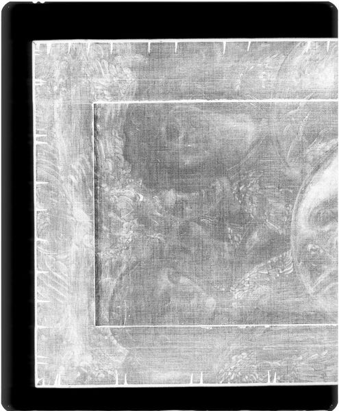 Editor: This is an X-radiograph of "Angel" by the School of Melozzo da Forli. It's fascinating to see the layers beneath the surface. What does this kind of imaging reveal about the painting's history and construction? Curator: The X-radiograph allows us to peer into the artistic process and choices made. Consider how the artist's workshop system might have influenced the painting's construction. Did they re-use panels? Were there multiple hands at work? Editor: So, the hidden layers tell a story about artistic collaboration and resource management? Curator: Exactly. It shifts our focus from the single genius artist to the broader social and economic context of art production in that period, offering insights into workshop practices and the cultural value placed on materials. Editor: That's a completely different perspective than just looking at the finished painting! Curator: Indeed. We are invited to reflect on the power structures within artistic communities and how museums shape our understanding of art historical narratives. It has been a pleasure to explore that with you.