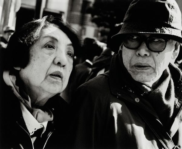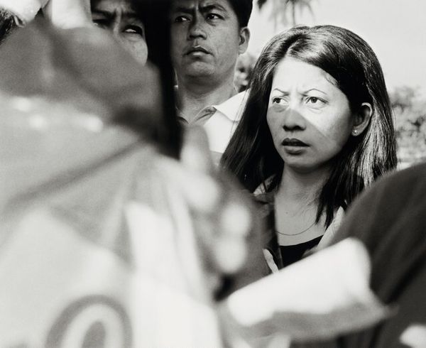 Curator: We're looking at "Tokyo, 2003, at Shinjuku Station," a photograph by Leo Rubinfien, likely captured sometime between 2003 and 2014. Editor: It's somber, almost melancholic. The monochrome palette and the downward gaze of the subjects create a feeling of introspection and isolation within the urban throng. Curator: The composition is masterful. Rubinfien employs shallow depth of field, focusing our attention on the woman in the foreground while blurring the anonymous crowd. This sharp focus isolates the subject. Editor: Yes, that material isolation is striking. It also makes me think of the labor and industry which underpins Shinjuku Station: the trains, construction, all that movement of people as essentially workers heading to work in the giant metropolis. What narratives of daily life might be encapsulated here? Curator: Perhaps the emotional tenor arises from the contrast between the sharp foreground and the ambiguous background? We, the viewers, like the subjects, can't make sense of what goes on around us. The geometry of the scene creates this tension: see how the subjects interact with the play of dark and light around them. Editor: This photograph highlights the texture of the coats they are wearing and other aspects of their lived, material surroundings in great detail, which suggests a level of affluence. Yet even so, are these material comforts also part of some daily drudgery that has an isolating aspect in each of their lives? Curator: It is certainly a portrait of urban alienation but beautifully rendered as the shapes soften around each character in the portrait and in the broader setting. Editor: It's a compelling image that captures the energy and potential isolation of urban life in contemporary Tokyo through a close material analysis. Curator: Indeed, it exemplifies how a moment frozen in time can evoke such profound questions about our connection—or disconnection—to the world around us.