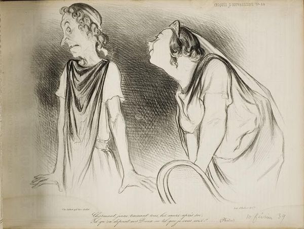 Editor: This is Honoré Daumier's lithograph, "...princes too generous..." It's interesting how Daumier uses a relatively simple material like lithographic crayon to convey such strong expressions. What's your take on it? Curator: The print's material execution—cheap, easily reproduced—speaks volumes. It democratizes art, moving it from elite salons to the streets. The expressions, etched with a greasy crayon onto stone, highlight the physical labor of political critique. Editor: So the medium itself becomes part of the message, critiquing power structures through its accessibility? Curator: Precisely. How does the lithographic process influence your understanding of the subject matter? Editor: That's a great point; I hadn't considered the material implications so deeply! Curator: Thinking about process helps us see the layers of meaning.
