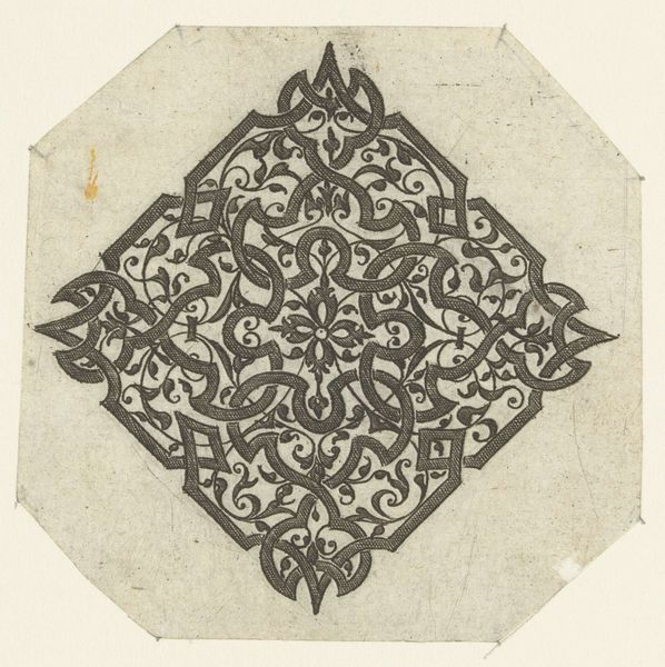 Curator: Here we have Theo Nieuwenhuis' "Ornamentale vlakvulling in een cirkel," dating from between 1876 and 1951, currently residing here at the Rijksmuseum. Editor: My initial response is its stunning duality. The black ink on paper creates an almost hypnotic oscillation between positive and negative space, a pulsating rhythm that draws the eye. Curator: It is exemplary of the Art Nouveau movement, where artists sought to integrate ornamentation seamlessly into functional objects, elevating craft to fine art. Editor: Absolutely, and that ornamental character derives specifically from pattern-and-decoration as it relates to surface design. We see repeating stylized floral motifs arranged radially, the dark and light balanced to create perfect symmetry within the circular format. There’s something inherently pleasing about such controlled harmony. Curator: Consider too the psychological impact of symmetry. The repeated motifs evoke a sense of ritual, of meditative practice—a visual mantra. We often see such circular arrangements in mandalas from various spiritual traditions. Editor: And in the geometry of rose windows of gothic cathedrals. Interesting how universal forms manifest in these particular patterns and decorations. The execution, in India ink, gives the piece a remarkable sharpness despite its intricate detail, further emphasizing that oscillation between depth and plane. Curator: These designs weren’t just aesthetically pleasing; they served a function, intended as models for larger decorative schemes in architecture and applied arts. It reflects the optimism of the Art Nouveau period and a deep faith in the power of design to ennoble everyday life. Editor: A faith visualized perfectly through its lines, form, and composition. It goes beyond mere decoration; it articulates meaning, balance, and hope. Curator: Indeed, it offers a lens to see design as not superficial but a deeply meaningful aspect of cultural expression. Editor: An expression that still resonates today.