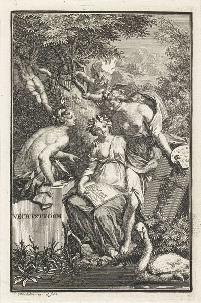 Curator: At the Rijksmuseum, we have François van Bleyswijck’s “Allegory on Poetry,” an engraving likely completed between 1681 and 1718. It's brimming with figures, objects, and classical references. What strikes you about it? Editor: My eye is drawn immediately to the abundance of cherubs. They create a sense of playful innocence that seems juxtaposed with the more serious themes suggested by the nudes and classical imagery. Curator: Precisely. These putti, common in Baroque allegories, contribute to the overall sentiment, but let’s not overlook how the historical context infuses this engraving. The Dutch Golden Age, a period of unprecedented artistic and intellectual production, saw such allegories flourish as a means of conveying complex ideas about society and culture. Editor: Absolutely. The arrangement is intriguing: paintings displayed within the print itself, resembling theater backdrops. Each depicts scenes associated with poetry—musicians, a scribe. The three female figures at the upper right evoke the classical muses or perhaps the graces, don't they? Curator: Indeed. They lend an air of timeless inspiration to the scene, channeling classical ideals into a celebration of poetic art. The choice to render the entire composition in the intricate detail of engraving enhances the work’s intellectual weight. The medium elevates it from mere decoration to a statement on poetry's lasting impact on culture. Consider its distribution as a print too; this made artistic ideas widely accessible. Editor: Thinking about accessibility, what do you make of the inscription the cherubs are holding? It seems integral to understanding the work's overall intention. Curator: That's an excellent point. Inscriptions in allegorical prints were almost like a key, providing the viewer with a more direct way to decipher the visual symbolism, steering interpretation towards the intended meaning. Editor: Looking at the print, my imagination takes me back to the artistic and intellectual life of the era. Curator: And for me, it is an excellent window into understanding art's public function. Thanks for joining me to explore Van Bleyswijck’s engraving.
