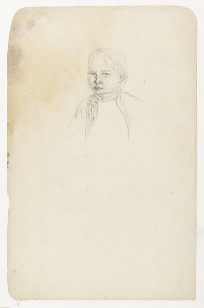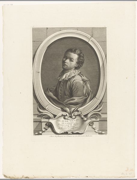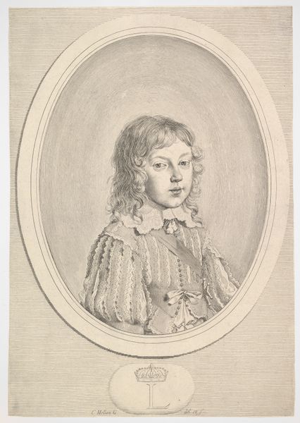 Curator: This is “Lezende jongen,” or “Reading Boy,” an etching by Johann Gottlieb Glume, dating from the 18th century. Editor: That kid looks mad. He’s really glowering at us, isn’t he? I wonder what story he's wrestling with, if he's scowling like that! Curator: It's fascinating how Glume captures such directness. The etching medium, with its delicate lines, emphasizes every crease in his brow and every button on his coat. It speaks to the democratization of art at that time; prints made art accessible to more people. Editor: Yes, look at the care Glume takes rendering the clothing-- almost fetishistic! Is he making some sort of implicit statement about the means of production? How the child's clothing seems valued equally as the knowledge they symbolize? And, how that small table nearly bleeds into the etched surface? Curator: It also allows for a certain intimacy, don't you think? I'm particularly drawn to the subtle modelling of the face, a very simple tonal range considering how emotional the piece ends up being. It makes me feel nostalgic. What if he is glowering because the story reminds him of something, some part of life he'd soon outgrow? Editor: Perhaps the simple tonal range is reflective of material constraints and accessibility. It highlights how this technique allowed more widespread consumption. Though I would expect him to smile while reading a children's story. It gives me more questions than feelings... Curator: Hmm, a different story, I suppose, in every heart. Even those of stubborn young boys in old etchings! I love how this little piece gives you such pause. Editor: Well, thank you for the insightful look. It's a piece that, on reflection, has me intrigued by the accessibility afforded by prints in that era and their ability to mirror evolving class dynamics.