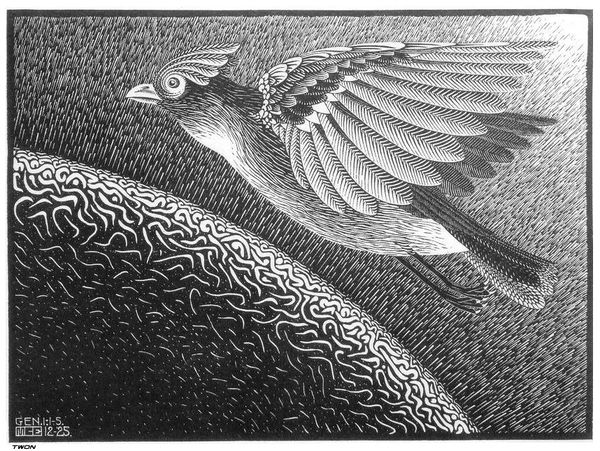 M.C. Escher made this print called Birds, using a woodcut. The contrast of black and white is so striking, but it’s really the intricate patterns that catch my eye. There’s a rhythm to the way Escher repeats shapes, especially in the feathers. You can almost feel the texture of the wood, the way the knife carves out each shape, leaving a raised surface that holds the ink. Look at the body of the large bird. It’s made up of these little dots, like a field of tiny pebbles. Then, zoom out and you realize it’s all part of this grand design. That’s Escher for you, always playing with scale and perspective. You can see the influence of artists like Albrecht Dürer, who also embraced the graphic possibilities of woodcut. Escher takes those lessons and runs with them, creating his own unique visual language. It's a reminder that art is always in conversation, with each artist building on the ideas of those who came before.