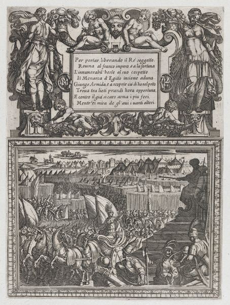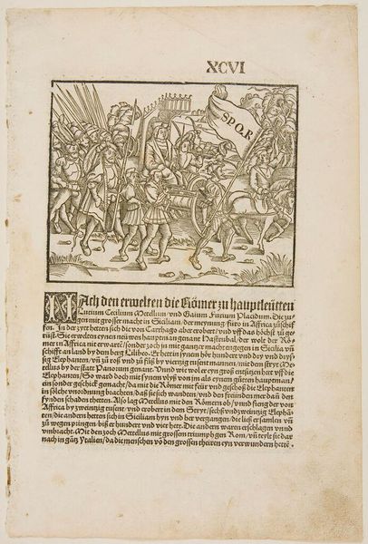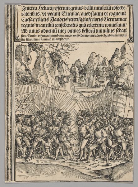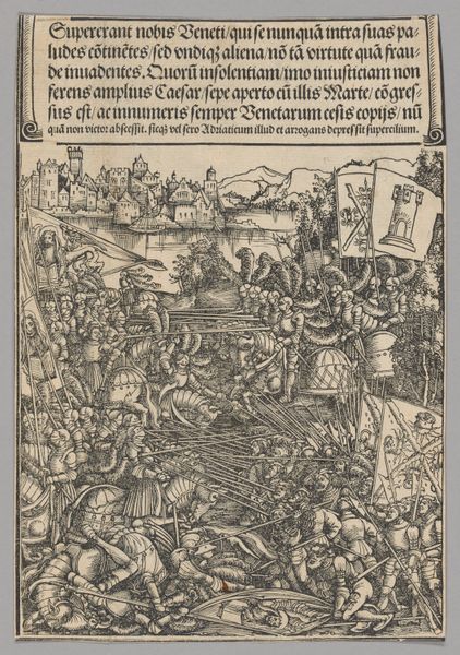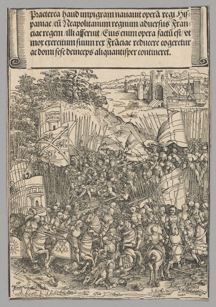 Editor: Here we have "Bavarian War, plate 18 from Historical Scenes from the Life of Emperor Maximilian I from the Triumphal Arch" created around 1515-1520 by Wolf Traut. It’s a woodcut print in ink on paper. There's so much activity crammed into the scene, almost chaotic. What strikes you most about this piece? Curator: Chaotic, yes! Like a visual earthquake. Imagine being bombarded by this barrage of black lines in the 16th century! Traut isn't just illustrating a battle, he's crafting a *propaganda symphony* for Emperor Maximilian. What story do you think he's trying to tell? Is it only one of pure violence? Editor: Well, with all the soldiers and cannons, I initially just thought 'war', but maybe it’s more about strength and power. Curator: Exactly! Think of it as an Instagram post of its time! It's about showing Maximilian’s dominance, right? The dense forest hints at a local setting while making the conflict seem monumental. Even the text at the top – have you considered it’s a kind of early caption or meme commentary? Editor: A meme! I love that idea. So, it's like, "Maximilian: Total Victory!"? Curator: Perhaps! The way he crams everything into the frame, a wild, almost overwhelming feeling is achieved. It is like shouting. Also, note the detail; this may well serve as a source of historical knowledge. What would people viewing this artwork from centuries into the future possibly learn, looking at it? Editor: I never thought of it like that. I focused so much on the chaos of the battle that I didn't notice the shields and armor! Curator: Traut packed layers of meaning into this relatively small print, almost 500 years ago! So much more to discover than I’d initially imagined. Editor: I will never look at an old print the same way again. Thanks!
