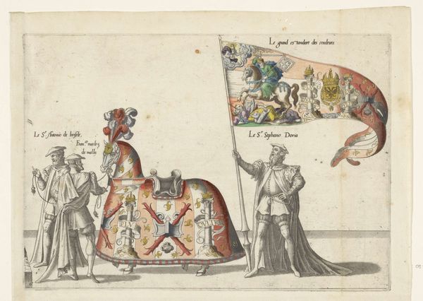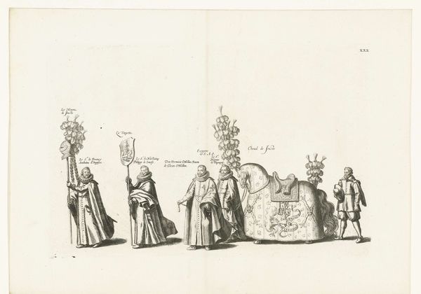 Editor: So, this engraving is called "Deel van de optocht, nr. 24 en 25," by Joannes van Doetechum, created sometime between 1559 and 1619. It depicts a procession of figures holding various emblems. It feels quite formal and ordered to me, but I’m curious – what do you see in this piece, considering it was made using the printmaking technique? Curator: As a materialist, I find the *process* of engraving utterly fascinating. Think about the labor involved! Each line meticulously etched into a copper plate, a repetitive and physically demanding task. This print, disseminated widely, served not only as art but as a form of propaganda. Consider the materials - copper, ink, paper – and how their interaction allowed the ruling class to project their power. Who were the skilled laborers producing these images and how were they compensated for their labor? Editor: Propaganda… interesting! The emblems are so elaborate, do you think there is any symbolism behind their design? Curator: Precisely! Every crest, every banner represents a specific power structure. By studying the social and political context, we can decode the language of these symbols. Think about who consumed these prints, and how that consumption shaped their perception of power. Was this displayed privately or circulated publicly? This adds to my initial consideration on production value: did Doetechum use the line medium for his financial convenience or for some other, potentially ideological, concern? Editor: I hadn't considered the implications of the print medium itself, how its reproducibility served a political agenda and provided or obfuscated opportunities for labor. It's like the material dictates its use and therefore, it's value to that society! Curator: Exactly! And looking at it from the viewpoint of labor challenges the canonization of these types of images! Editor: It certainly does. Thanks, I have a whole new perspective now. I can appreciate that print wasn’t *just* the technique!