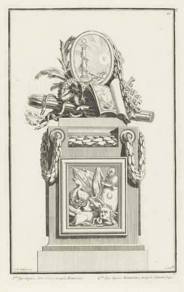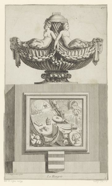 Jean Charles Delafosse created this engraving, simply titled "Holland," in the late 18th century. It is a complex allegorical depiction of the region, laden with symbols of power, nature, and history. The rampant lion on the central shield is the Dutch national symbol, projecting strength and pride. But beneath it, a ram's skull—a memento mori—reminds us of mortality and the transience of earthly power. We see this skull motif echoing through centuries, from ancient Roman vanitas to the still life paintings of the Dutch Golden Age, each time reminding viewers of life's fleeting nature. Above the lion, the pastoral scene enclosed in a circle suggests Holland's landscape and its bounty. Here we find a connection to the ancient Roman concept of the locus amoenus—an idealized, safe space in nature. The inclusion of weaponry, the scales of justice, and the map speak to governance, law, and geographical identity. The way these symbols converge speaks to a powerful collective memory.