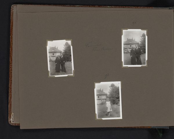 Curator: Here we have a gelatin-silver print entitled "Friends and Ship," created anonymously between 1939 and 1942. It’s part of the Rijksmuseum collection. Editor: It's stark, isn’t it? Very high contrast. The whole composition feels very intentional, very framed. The blacks are deep. It certainly speaks of a time of solemnity. Curator: Absolutely. Thinking about the production of this image, gelatin-silver printing was a common process at the time, relatively accessible, which suggests a more personal, rather than purely artistic, motivation behind the piece. The material tells us something about its place in everyday life. Editor: Yes, and if we zoom in on the picture with the four figures – they’re rigidly posed, their naval uniforms sharply creased, but there is the use of light and shadow which helps define them beyond pure documentary. Curator: The societal role of photography then played a crucial part. Photography became both a way of constructing memory but also projecting strength through state symbolism. The fact these two separate photographs are displayed together is equally important to our interpretation. Editor: Precisely, but that careful composition creates layers within the frame. Look at the parallel lines and strong horizontal emphasis in the ship photograph. How this relates to the same ordering principle governing the placement of photographs on this page. Curator: And placed as a remembrance. The ship below is suggestive of the realities of military life, of labour at sea, reflecting the historical context of its making. What's perhaps been consumed through the creation of this is not only the materials for the photographs, but the lives and service implied within. Editor: True, however the photograph creates such strong patterns. A sort of narrative, as opposed to any real commentary about how it may have been used or what they thought about the work in reality. Curator: It is precisely that narrative woven into these photographs that is so captivating. Thanks for providing such insights. Editor: Indeed. A great start to our tour.