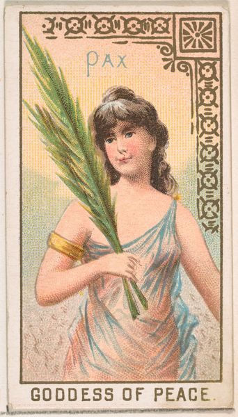 This small chromolithograph of Cybele, Goddess of Civilization, was issued by Wm. S. Kimball & Co. as part of a series on Greek and Roman goddesses. The visual field is dominated by a central figure who exudes a composed beauty, standing in contrast with the raw power of the lion at her side. The goddess is adorned with symbols of authority: a crown, an ornamented bracelet and a scepter, which underscore her dominion. The lion, traditionally a symbol of untamed nature, is here subjugated, serving to emphasize Cybele’s role as a civilizing force. The lines are crisp, and the rendering precise, yet the composition does not aim for depth, instead it emphasizes surface and contour. This piece employs a semiotic structure where each element functions as a signifier. The goddess and her attributes serve as a tableau of power, evoking broader cultural narratives about the relationship between civilization and nature. In this context, the artwork prompts us to question fixed meanings and explore the narratives encoded within these historical representations.