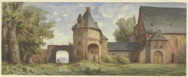 Editor: This artwork, titled "Stadspoort met torens," translating to "City Gate with Towers," is attributed to Alexander Oltmans, likely created between 1824 and 1853, utilizing watercolor and other drawing media. The somber tones and precise architectural detail give it a melancholic, almost ghostly, atmosphere. How do you interpret this work? Curator: My attention is drawn to the masterful interplay of form and light. Consider the meticulous detail in rendering the brickwork versus the softer, almost blurred edges of the surrounding foliage. The composition adheres to a carefully constructed verticality, emphasized by the towering structures. Note how the artist modulates the watercolor to suggest depth and texture. The gradations of color, ranging from muted greys to earthen browns, create a subtly dynamic surface. Do you perceive a deliberate structural relationship between the towers? Editor: I hadn't considered it that way. I was more caught up in the historical feeling. But now I see, there's a clear relationship of the towers, yet slightly asymmetrical. What do you think that asymmetry tells us about the piece, if anything? Curator: The asymmetry introduces an element of visual tension. Instead of a purely representational study, Oltmans offers a nuanced commentary on architectural form itself. Is the divergence merely aesthetic, or does it symbolize a deeper fracture within the city’s historical narrative? These are worthwhile avenues of formal enquiry. Editor: That's fascinating, looking beyond just the image, into the structure itself. Thank you! Curator: Indeed. Sometimes, the key lies not just in *what* is depicted, but in *how* it is presented.