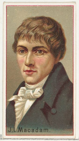 Curator: Here we have "A Life of John Jacob Astor," one of a series of collectible cards produced by W. Duke, Sons & Co. in 1888. These cards came with Duke brand cigarettes, part of a series called "Histories of Poor Boys and Famous People." Editor: It's charmingly unassuming, isn’t it? There's a straightforward quality to the rendering. I feel as if it were found tucked inside an old book... Curator: These were mass-produced through colored pencils and print. The cards served less as high art and more as marketing tools. But they’re a fascinating window into the values that were celebrated at the time, and how they intersected with consumer culture. Editor: Right, that’s the charm. It’s advertising aspiring to art, and yet somehow completely revealing of its era. The soft pastels give Astor a kindly, almost paternal feel... though I suspect his business practices were likely a bit more cutthroat. Curator: Precisely. It's interesting to consider the labor involved. Factory workers assembling cigarettes, inserting these cards. Consider the distribution network required to spread these images and their aspirational narratives nationwide. Editor: The portrait itself seems lifted from a more formal painting, perhaps even a steel engraving, then softened and domesticated for this purpose. And the vaguely ukiyo-e swirl behind him almost promises transformation from ‘poor boy’ to…well, tobacco magnate bait? Curator: It reveals how art and consumerism can blur into one another, shaping perceptions and driving economic engines. Editor: Exactly. And despite the card's humble origins, it leaves me thinking about the grand narratives woven around individual success—especially who gets remembered, and by what means! Curator: It's more than meets the eye. A reminder of art's capacity to intertwine with everyday life and culture. Editor: Indeed, making us look closer at the labor of those who made the products, and the cultural conditions of our own.